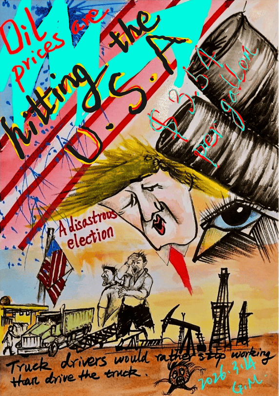 图(tu)1 从卡车(che)司机到中期选举,油(you)价正(zheng)打击美国 纸本彩墨 37.5cmX26.5cm 李公明作 2026年3月14日