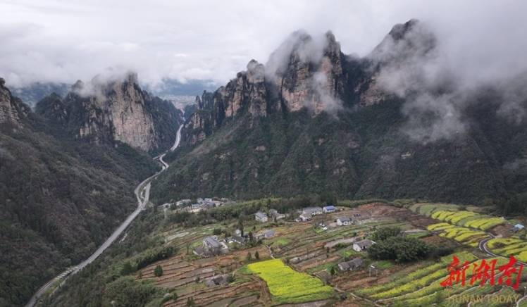 3月17日,雨后(hou)的张家界市武陵源(yuan)区百丈峡(xia)云雾缭(liao)绕。金(jin)黄的油菜(cai)花海铺展在田间,蜿蜒的旅游公路(lu)穿行个中,构成一(yi)幅恬(tian)静(jing)的山乡春日图景(jing)。吴勇兵 摄(she)(湖南图片库)