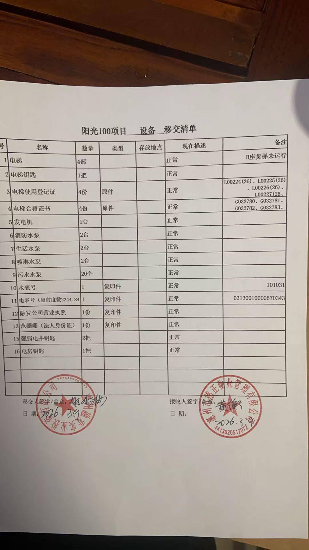 上(shang)述负责人提供的清单表示,3月9日,融发公司已经将阳光(guang)100小区的设备移交给德正物业,包括电梯、电梯钥匙、配电房等。小区的门岗和道闸系统(tong)没有交接,德正物业公司的保安岗目前(qian)只能在小区大堂值班,小区的地(di)下停车场(chang)岗亭还是融发公司的人在值守,地(di)面(mian)停车场(chang)是自动道闸系统(tong),权限还在融发公司手上(shang)。