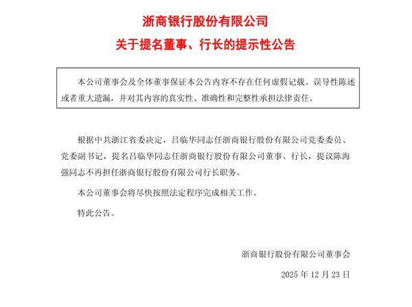 中国网财经(jing)12月24日(ri)讯 12月23日(ri),浙商银行发布公告显示,根据中共浙江(jiang)省委决定,吕临华任(ren)浙商银行股份无限(xian)公司党委委员、党委副书记,提(ti)名吕临华任(ren)浙商银行股份无限(xian)公司董(dong)事、行长,提(ti)议陈海强(qiang)不再担任(ren)浙商银行股份无限(xian)公司行长职务。