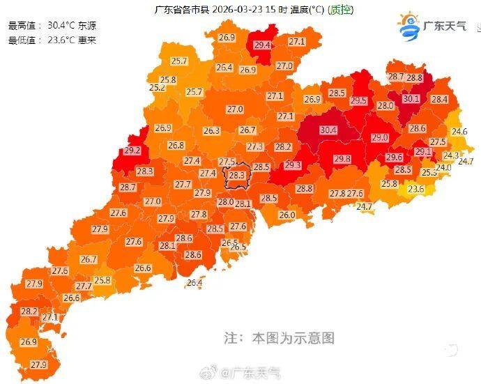 广东各市县2026-03-23 15时温度示意图(图源:@广东天气(qi))